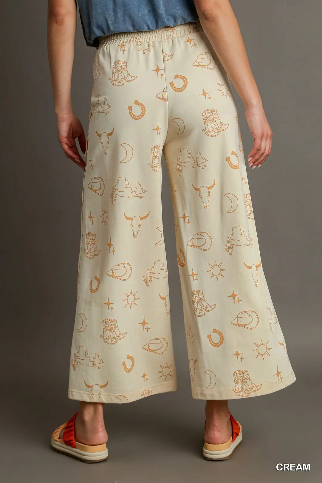 French Terry Elastic Waistband PantsDetails:• Wide Leg• Graphic Print• Side PocketsFit & Model Notes:• Model is 5'9" and is wearing a small.• All Measurements are approximate.• Not Lined.Fabric Contents:• 80% Cotton• 20% Polyester