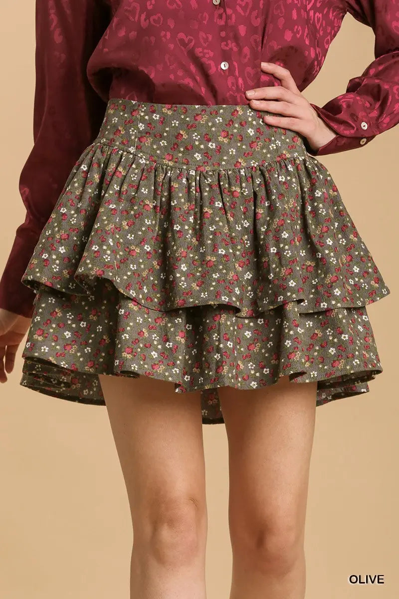 Floral Print Mineral Wash Layered Ruffle Skirt with No LiningFit & Model Notes:• Model is 5'9" and is wearing a small.• All Measurements are approximate.Fabric Contents:• 90% Polyester• 8% Nylon• 2% Spandex