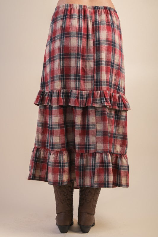 - Ruffle Plaid Tiered Midi Skirt - Elastic Waist w/ Drawstring - W/ Lining - Maxi Skirt