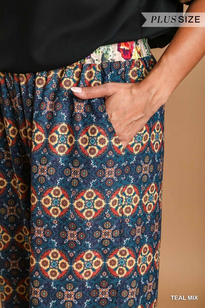 Plus Wide Fit Mixed Print Bottoms with Elastic Waistband & Side Pockets Model is 5'10" and is wearing an XL. Not Lined. 100% Polyester Western Wear Western Apparel Plus Size Clothing