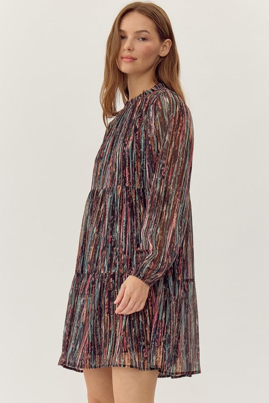 Multicolor chiffon dress with feminine frilled neck, back key hole, long peasant sleeves, and tiered silhouette. Christmas dress. Holiday dress. Party dress. - Model is 5'10'' and is wearing a Small.