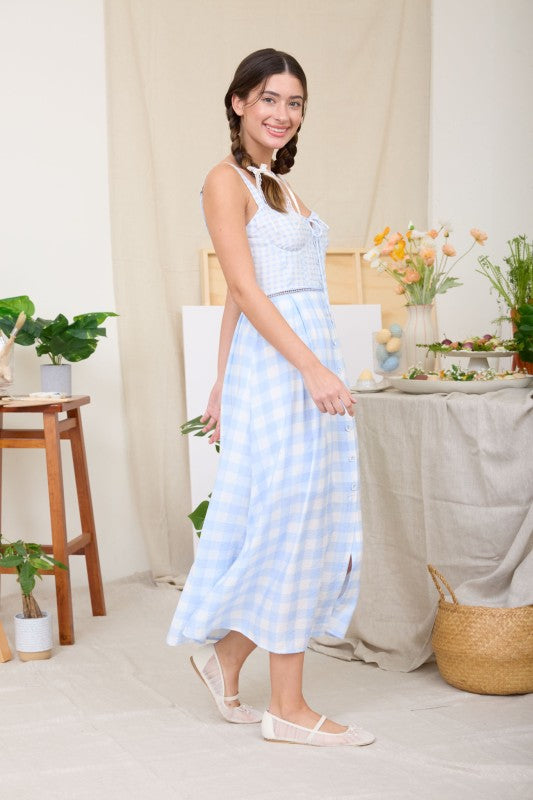SWEETHEART NECKLINE ADJUSTABLE SPAGHETTI STRAP FRONT TIE DETAIL WITH KEYHOLE CORSET DETAIL LINE LACE DETAIL BUTTON DOWN MOCK BUTTONS BACK SMOCKING MULTI PLAID PATTERN LINED MIDI DRESS SHELL:85%RAYON 15%NYLON CONTRAST:100%POLYESTER LINING:100%POLYESTER