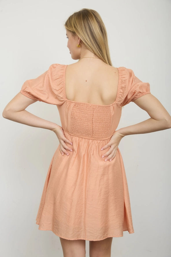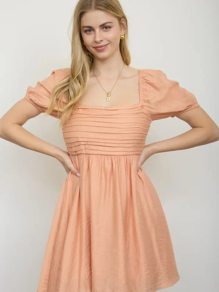 • Square neckline • Short puff sleeves • Elastic cuff detail • Back smocking • A-line • Solid • Lined • Mini dress • Shell: 80% RAYON 20% NYLON • Lining: 100% POLYESTER