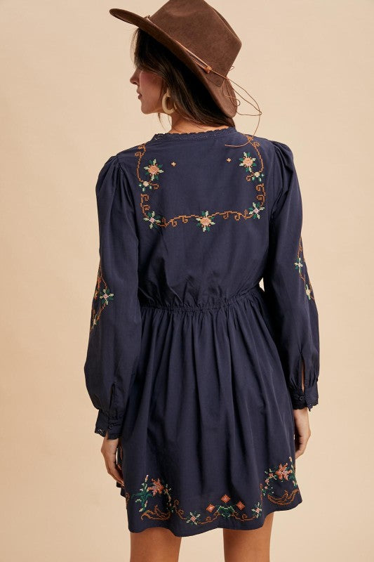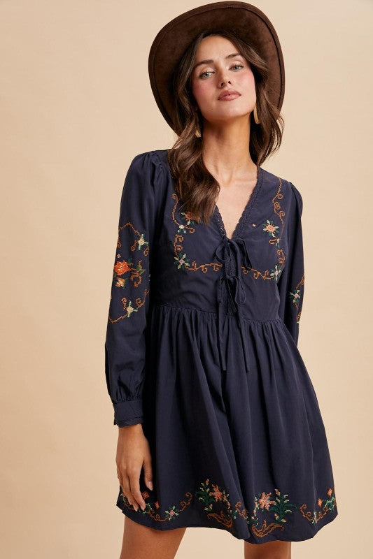 EMBROIDERED COTTON MINI DRESS FEATURES: - FLORAL EMBROIDERED MOTIFS ON FRONT, SLEEVES, HEM, AND BACK YOKE - LONG PUFF SLEEVES WITH BUTTONED CUFFS - DECORATIVE FRONT BOW TIES - LACE TRIM V-NECKLINE WITH FUNCTIONAL FRONT TIES - ELASTIC WAISTBAND AT BACK - SIDE ZIPPER - SIDE POCKETS - LINED