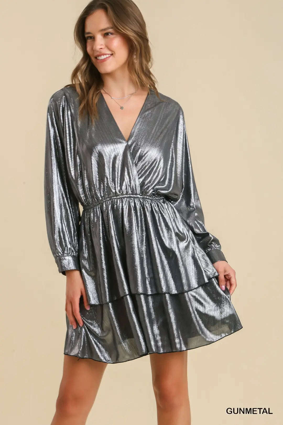 Surplice Neck Metallic Dress with Tiered Details and Elastic Waistband