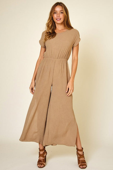 Solid ribbed round neck short sleeve top and pants set.