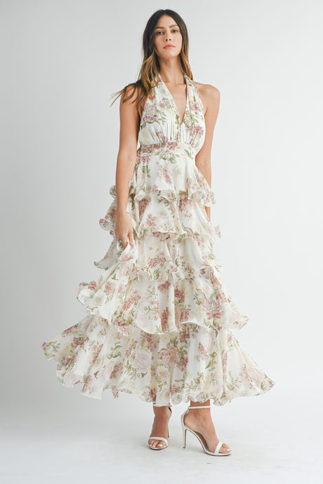 TIERED HALTERNECK FLORAL MAXI DRESS