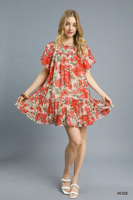 Floral Frill V Neck Puff Sleeve Ruffle M