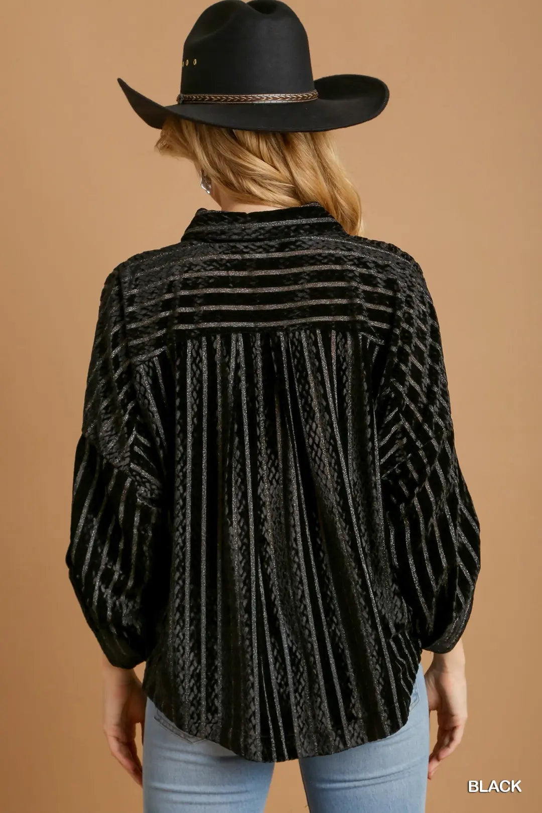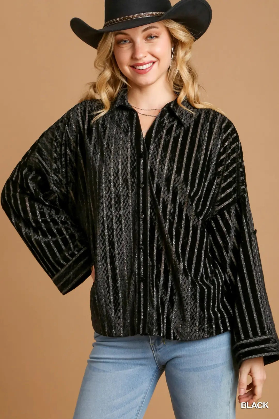 Metallic Textured Velvet Button Down Shirt with Adjustable Sleeve Button