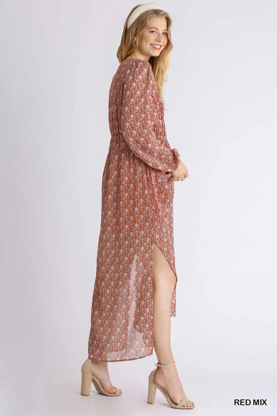 Sheer Floral Print Long Sleeve Smocked V-Neck Maxi Dress with Side Slits and LiningFit & Model Notes:• Model is 5'8" and is wearing a small.• All Measurements are approximate.Fabric Contents:• Please refer to Care Label for wash instructions• 97% Polyester• 3% Metallic