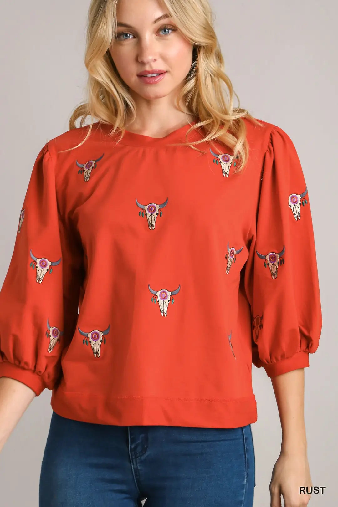 Crewneck 3/4 Sleeve Top with EmbroideryFit & Model Notes:• Model is 5'9" and is wearing a small.• All Measurements are approximate.• Not Lined.Fabric Contents:• 95% Cotton• 5% Spandex