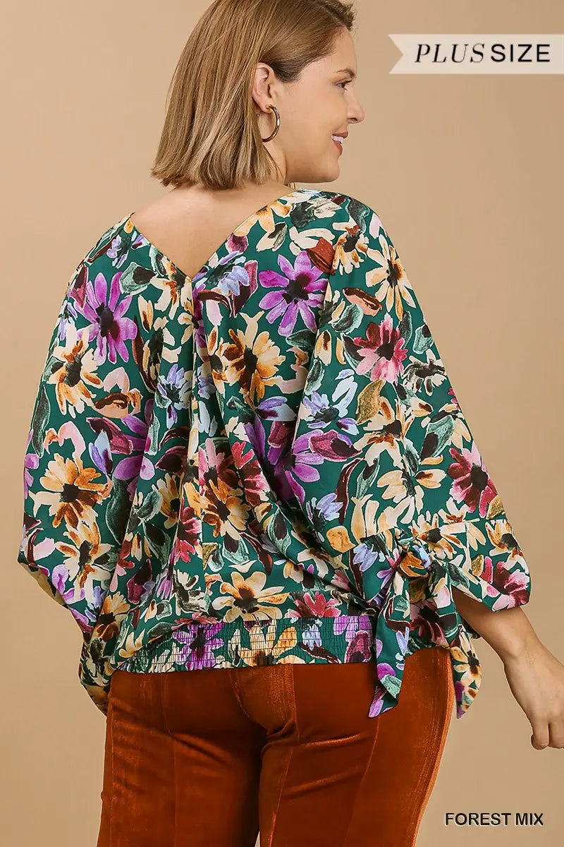 V-Neck Flower Print Tie Sleeve Top with No LiningFit & Model Notes:• Model is 5'10" and is wearing an XL.• All Measurements are approximate.Fabric Contents:• 100% Polyester
