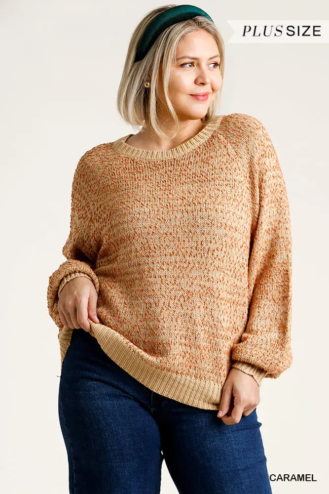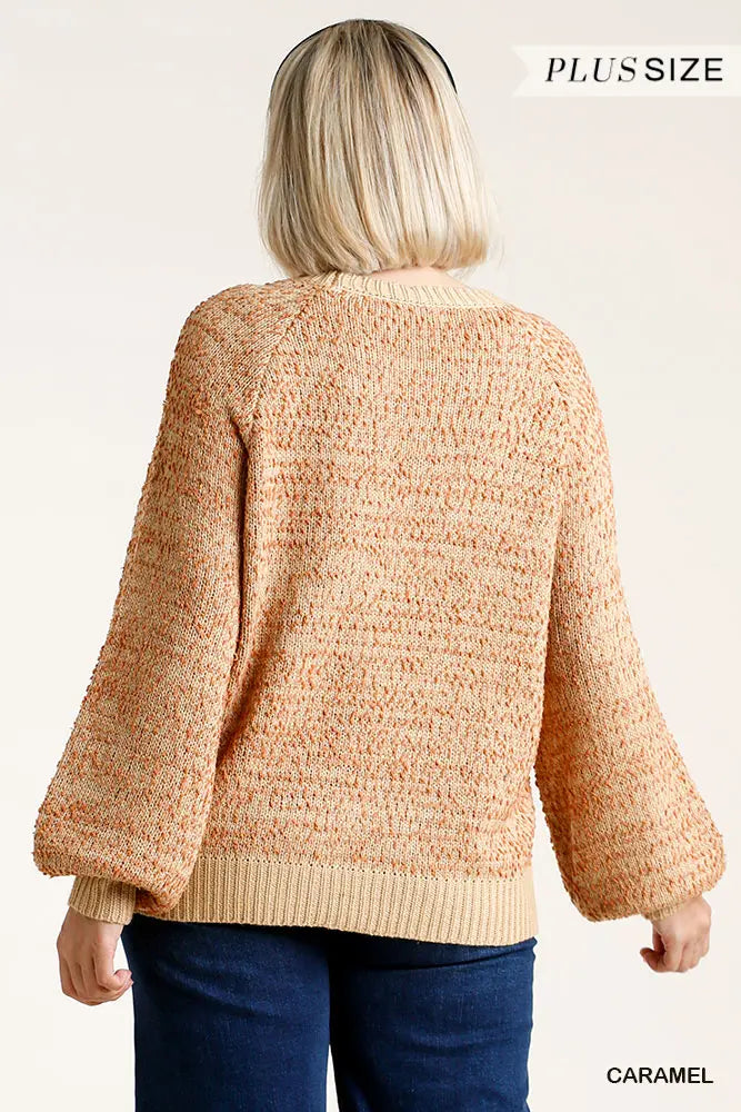 Round Neck Long Sleeve Popcorn Sweater with Ribbed Hem